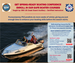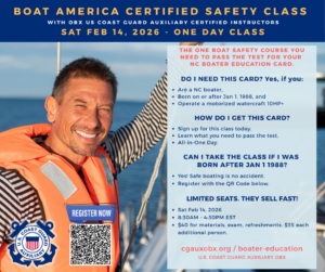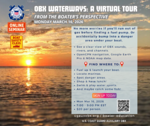 Unlock the hidden gems of the Outer Banks while safely boating the waterways with confidence and ease. This boater education course, taught by local U.S. Coast Guard Auxiliarists, gives you the inside knowledge to discover OBX attractions, boat launches, fueling spots, lunch destinations, and more—all from a boater’s point of view. Due to high demand and previous sellouts, a new class is now open for Monday, March 16, 2026. Join this exclusive 2-hour Zoom seminar and start planning unforgettable days on the water. (more…)